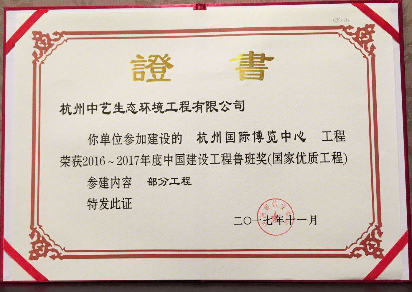 11月6日,中國建筑業(yè)協(xié)會在北京召開紀(jì)念“魯班獎”創(chuàng)立30周年暨2016~2017年度創(chuàng)精品工程經(jīng)驗交流會。由太陽成集團(tuán)tyc環(huán)境全資子公司——杭州中藝生態(tài)環(huán)境工程有限公司參建的杭州國際博覽中心項目喜獲中國建設(shè)工程質(zhì)量最高獎———中國建設(shè)工程魯班獎(國家優(yōu)質(zhì)工程)。